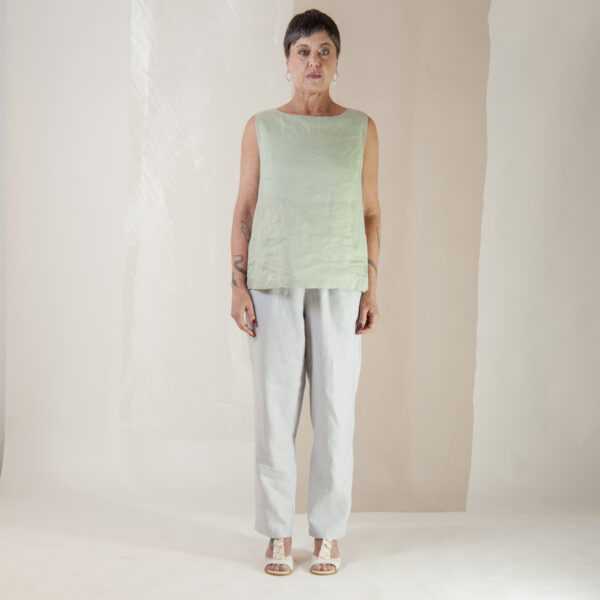 Confeccionada em tecido 100% linho. Fibra naturalmente sustentável, pois sua produção descarta o uso de agrotóxicos e utiliza nível baixo de água durante o plantio. Apresenta conforto térmico e durabilidade. A modelagem é autoral adaptada para mulheres maduras, com extremo conforto e caimento impecável.