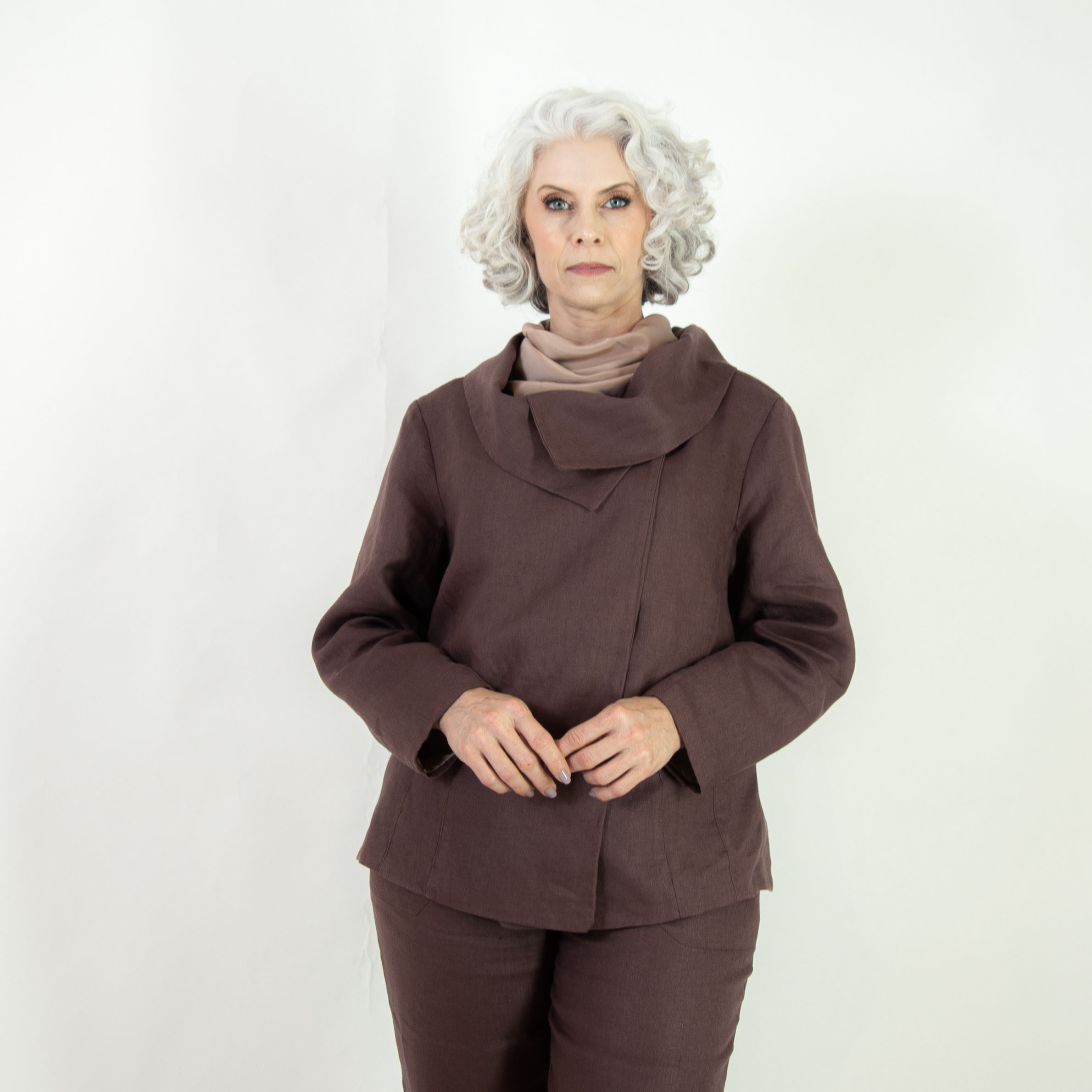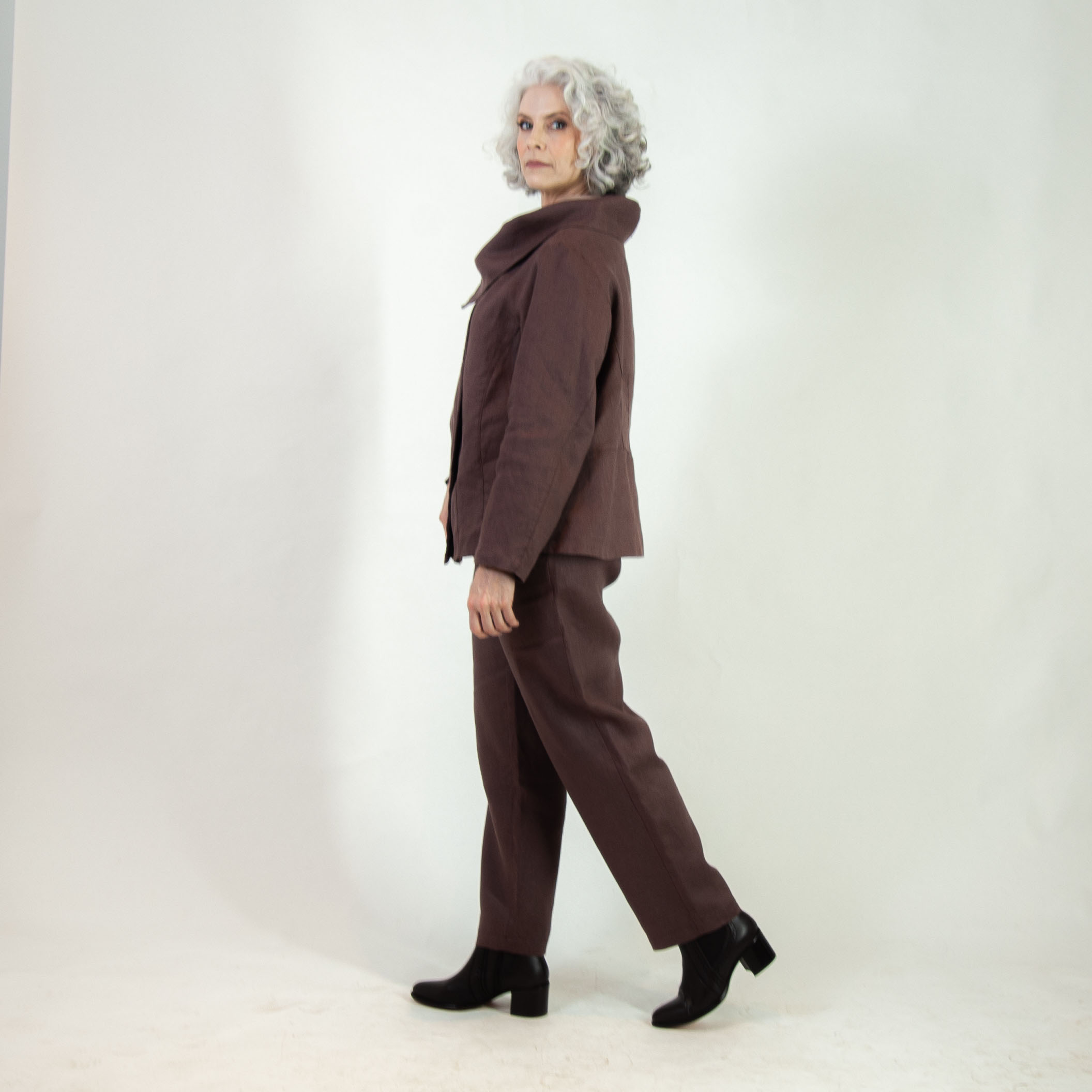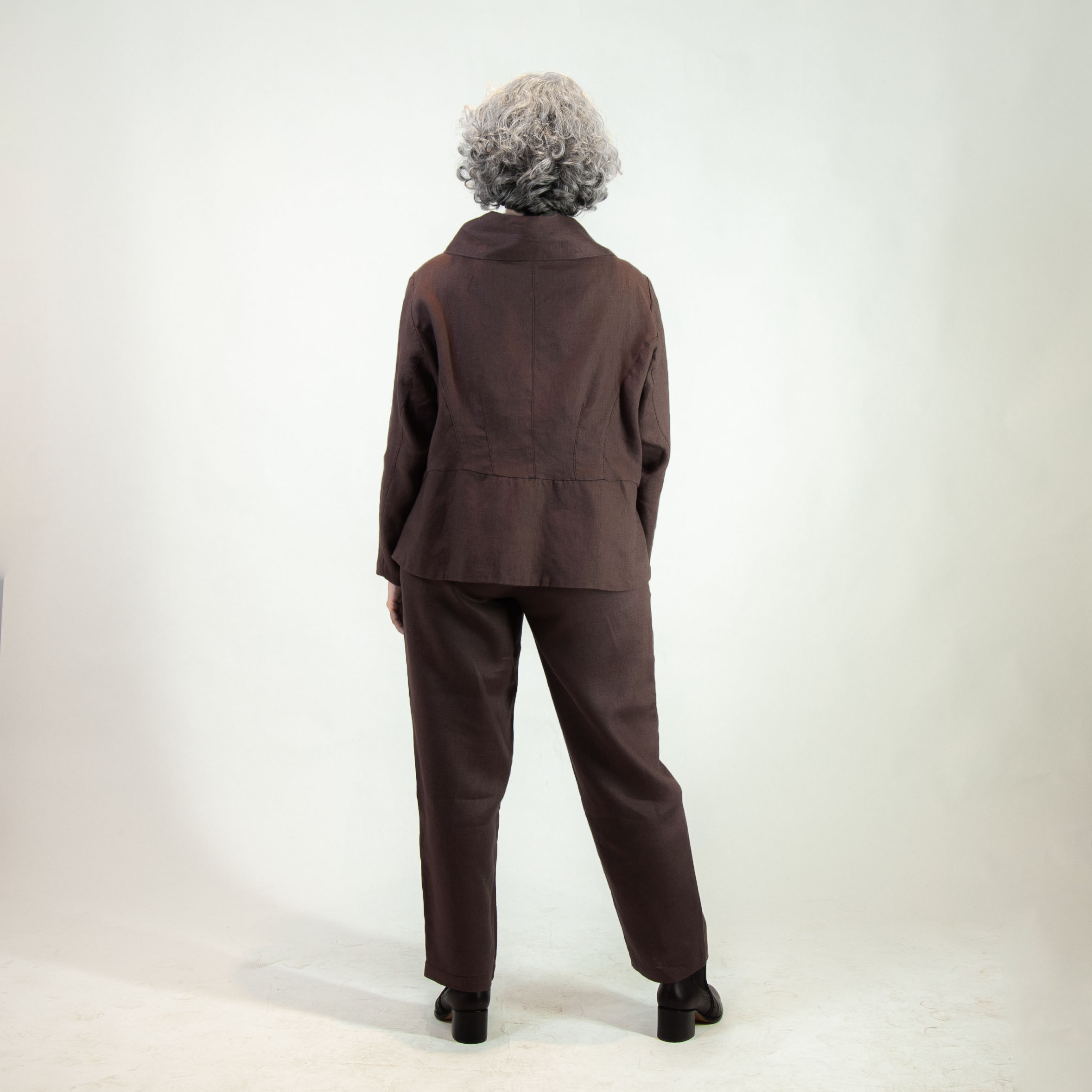 Conjunto composto pelo Casaco Línea e Calça Tradicional em Linho Puro na cor Cacau.