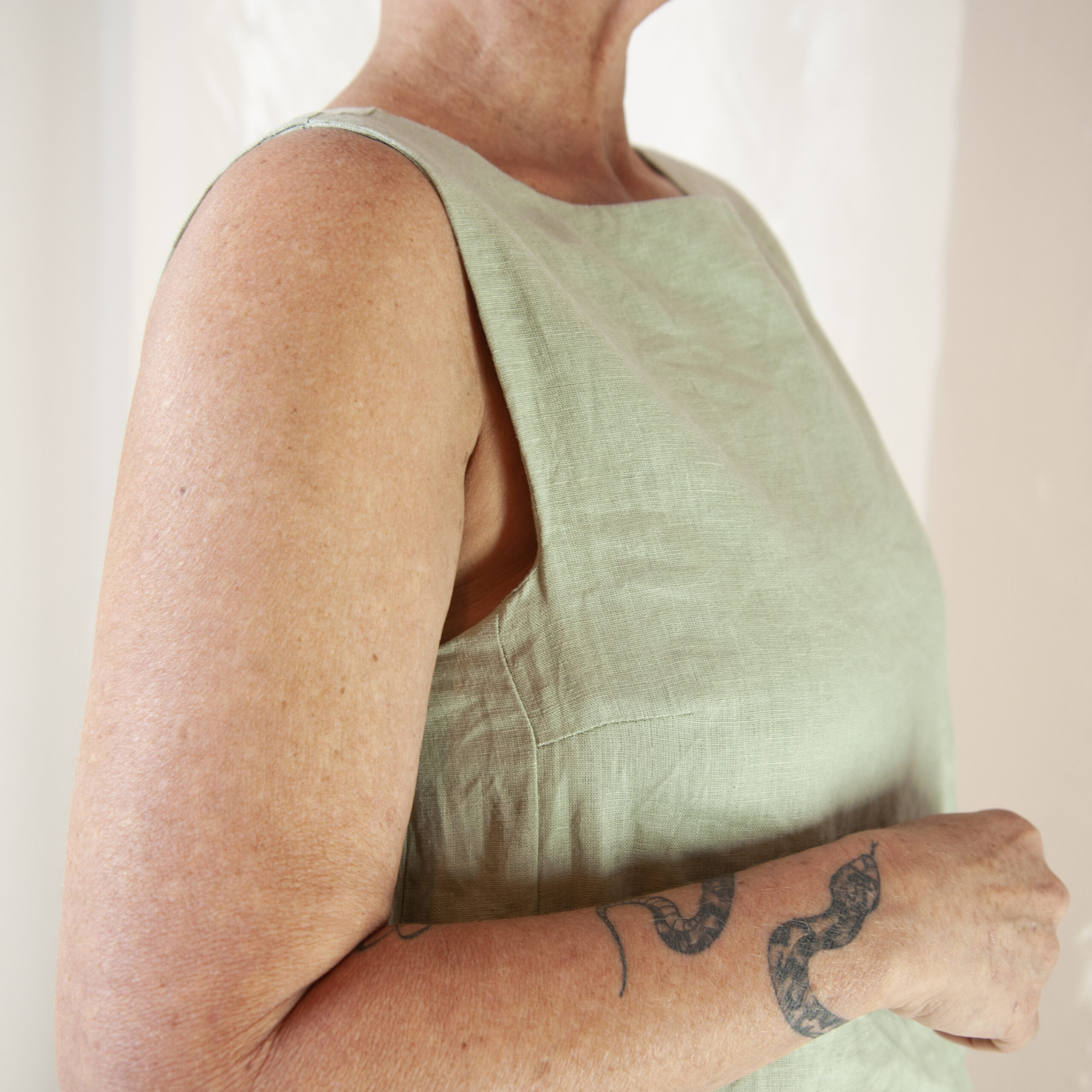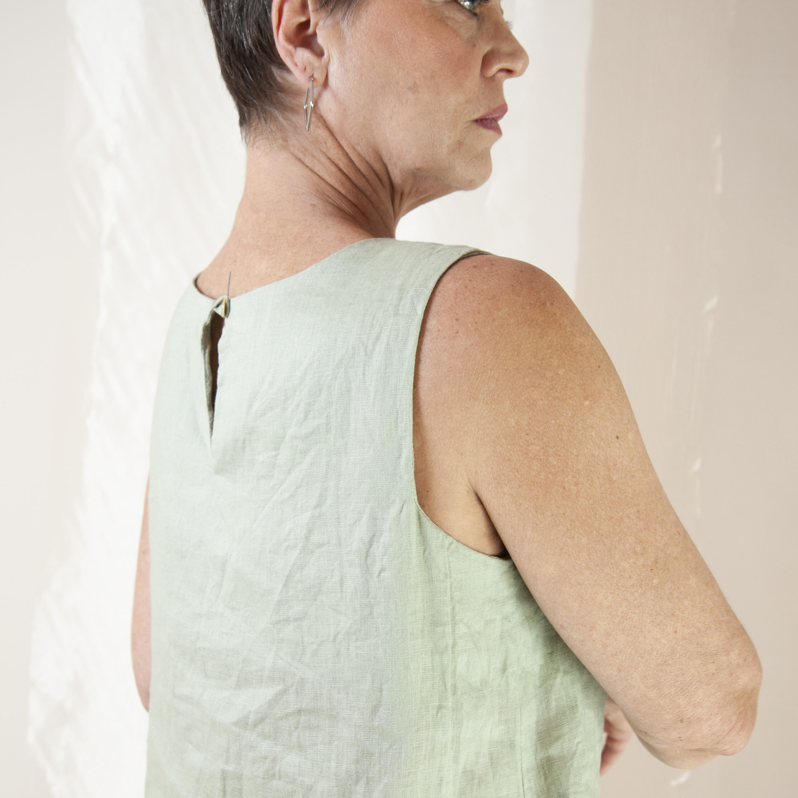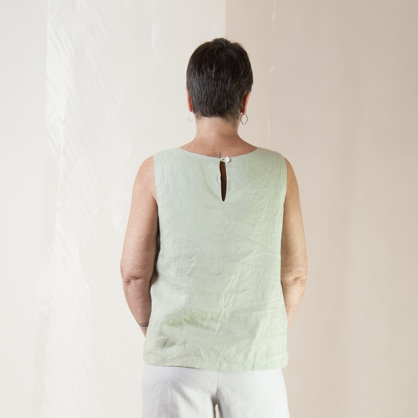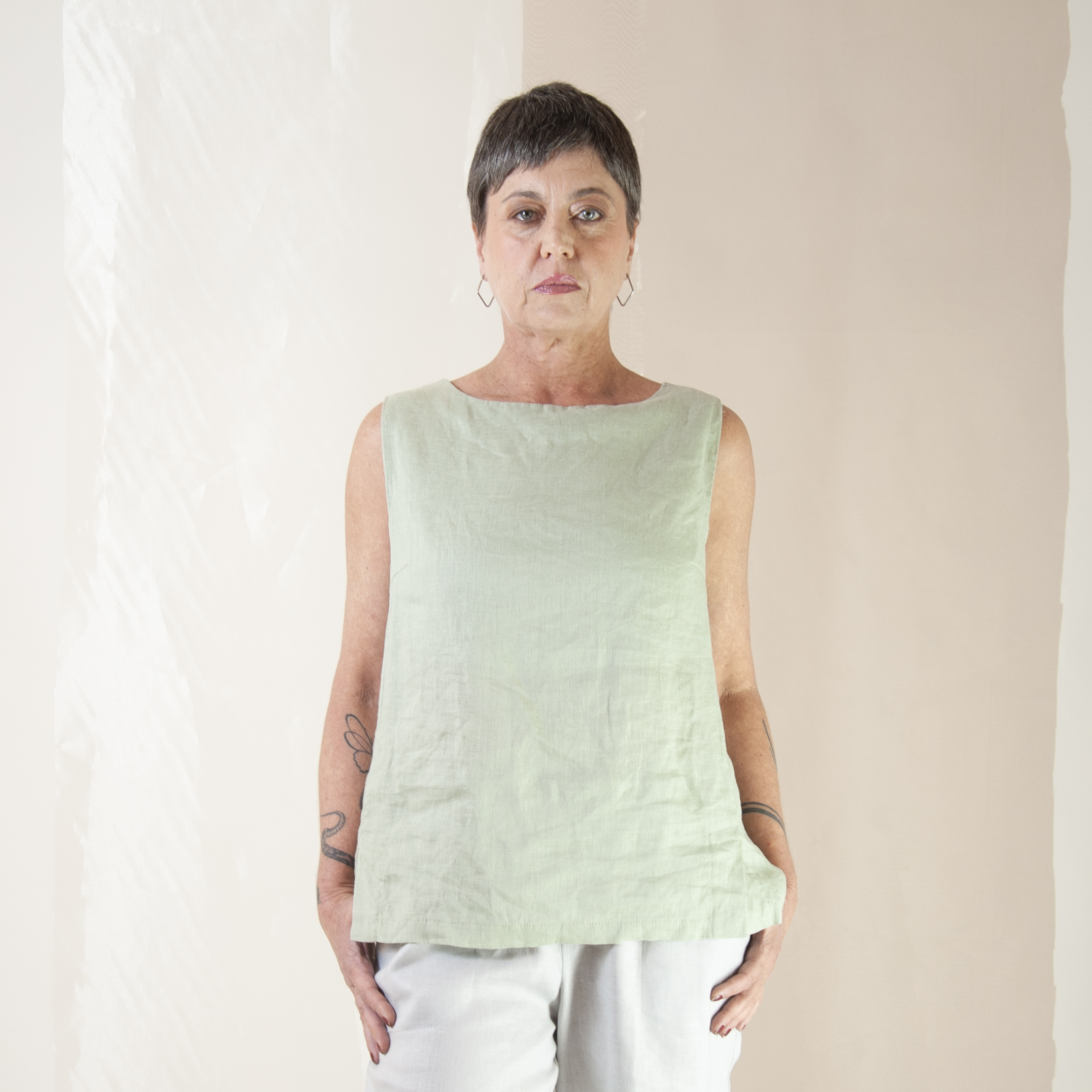 Regata em cambraia de Linho Puro leve e macio. Apresenta cavas quadradas, pequenas fendas bilateis frontais, decote alto e pequena abertura posterior com botão de madrepérola. Tem frente e costa forradas na região do busto proporcionando mais conforto e acabamento impecável